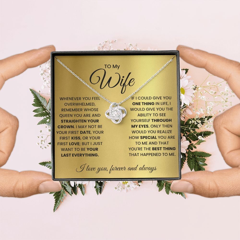 Presented with a heartfelt message card that reads, “To My Wife - Whenever you feel overwhelmed, remember whose queen you are and straighten your crown. I may not be your first date, your first kiss, or your first love, but I just want to be your last everything. If I could give you one thing in life, I would give you the ability to see yourself through my eyes. Only then would you realize how special you are to me and that you're the best thing that happened to me. I love you, forever and always.”, this elegant Love Knot Necklace celebrates your unbreakable bond.