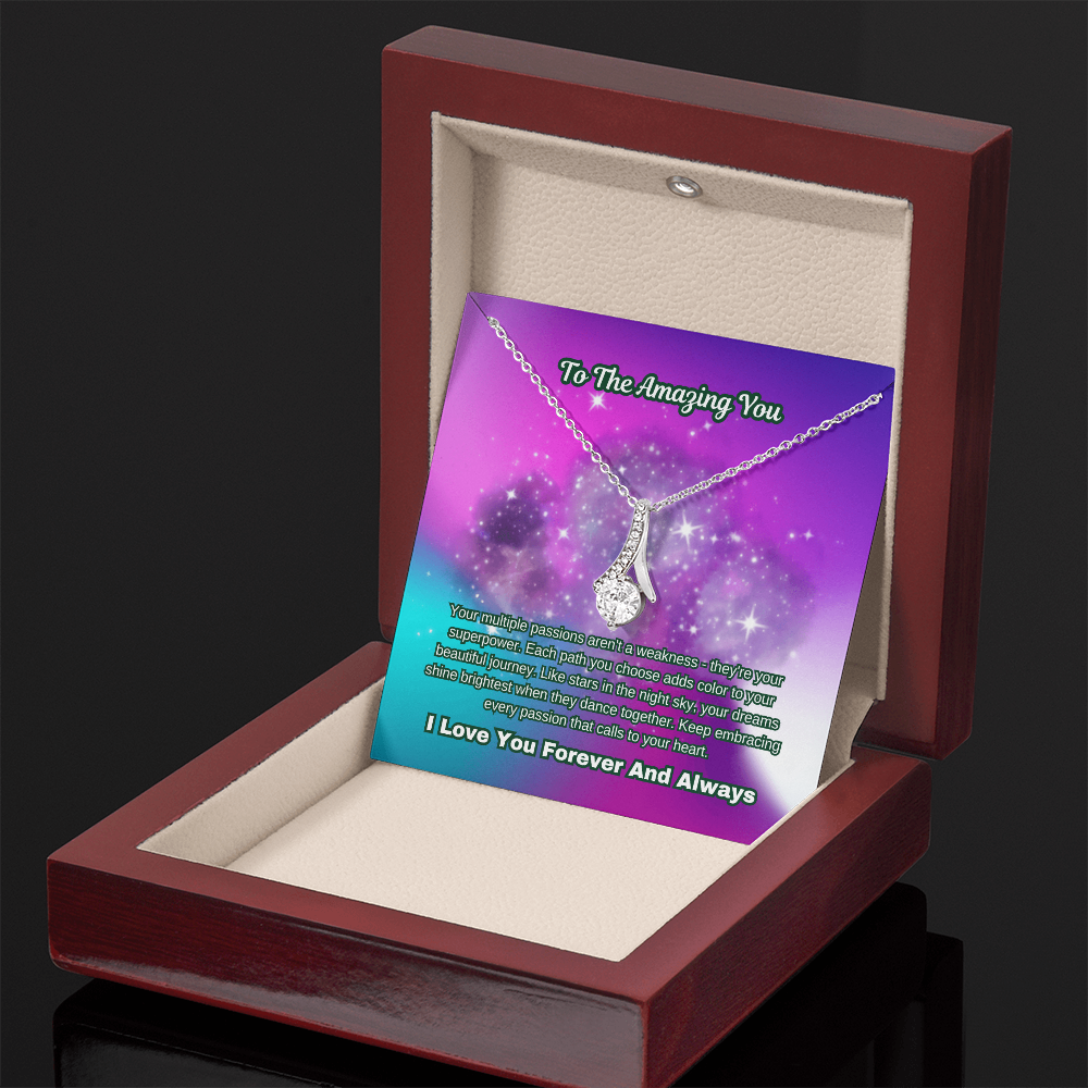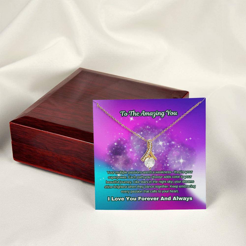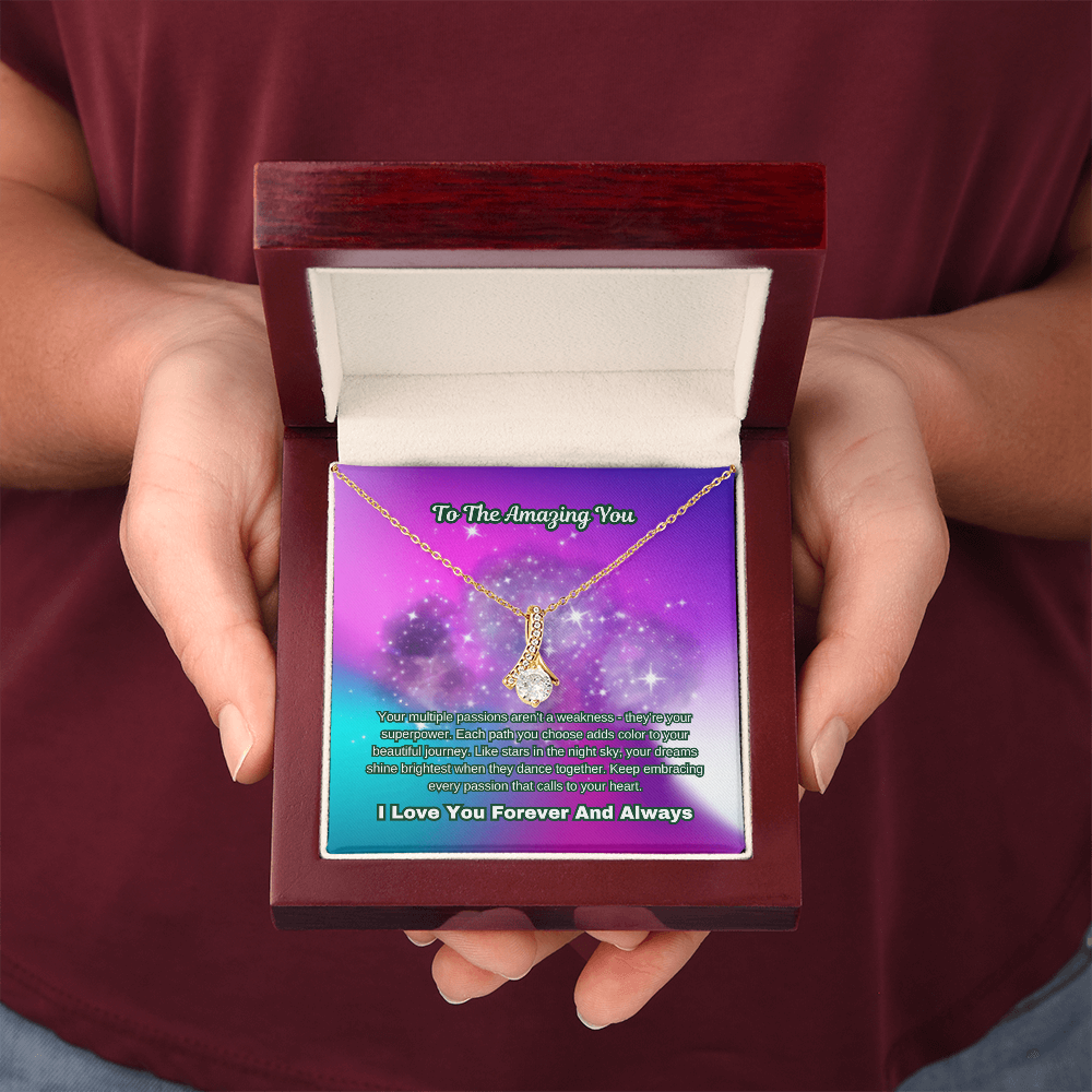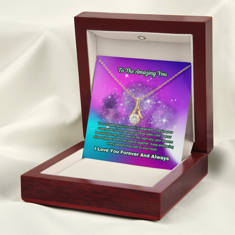 Each necklace comes with our exclusive 'To The Amazing You' message card that reads: 'Your multiple passions aren't a weakness - they're your superpower. Each path you choose adds color to your beautiful journey. Like stars in the night sky, your dreams shine brightest when they dance together. Keep embracing every passion that calls to your heart.' Followed by the heartfelt promise: 'I Love You Forever And Always'